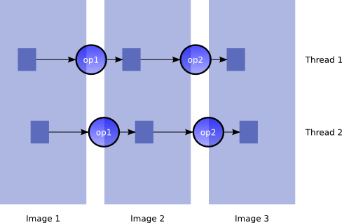 VIPS makes a set of guarantees about parallelism that make this simple to program. Start and stop functions are mutually exclusive and a state is never used by more than one generate. In other words, a start / generate / generate / stop sequence works like a thread.