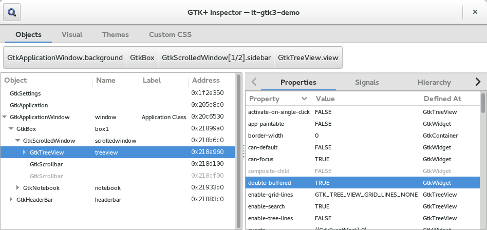 Note that the GTK+ inspector can only show GTK+ internals. It can not understand the application-specific logic of a GTK+ application. Also, the fact that the GTK+ inspector is running in the application process limits what it can do. It is meant as a complement to full-blown debuggers and system tracing facilities such as DTrace, not as a replacement.